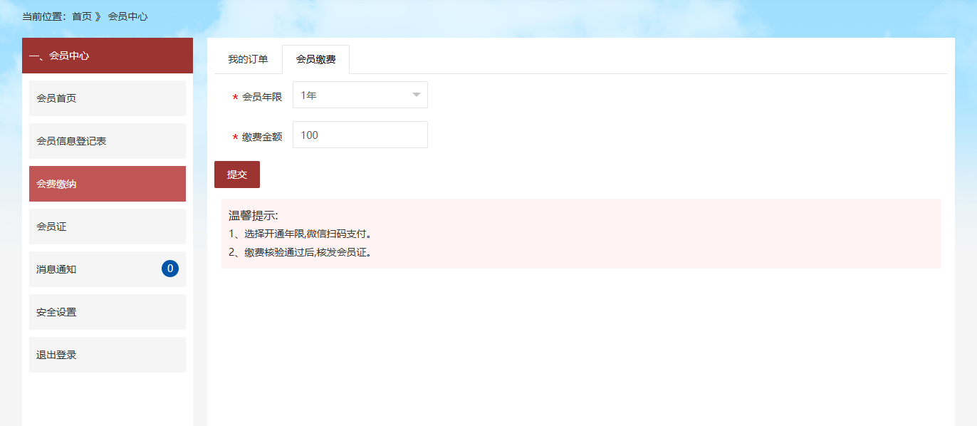 会员资料审核通过,根据系统提示短信内容缴纳会费;